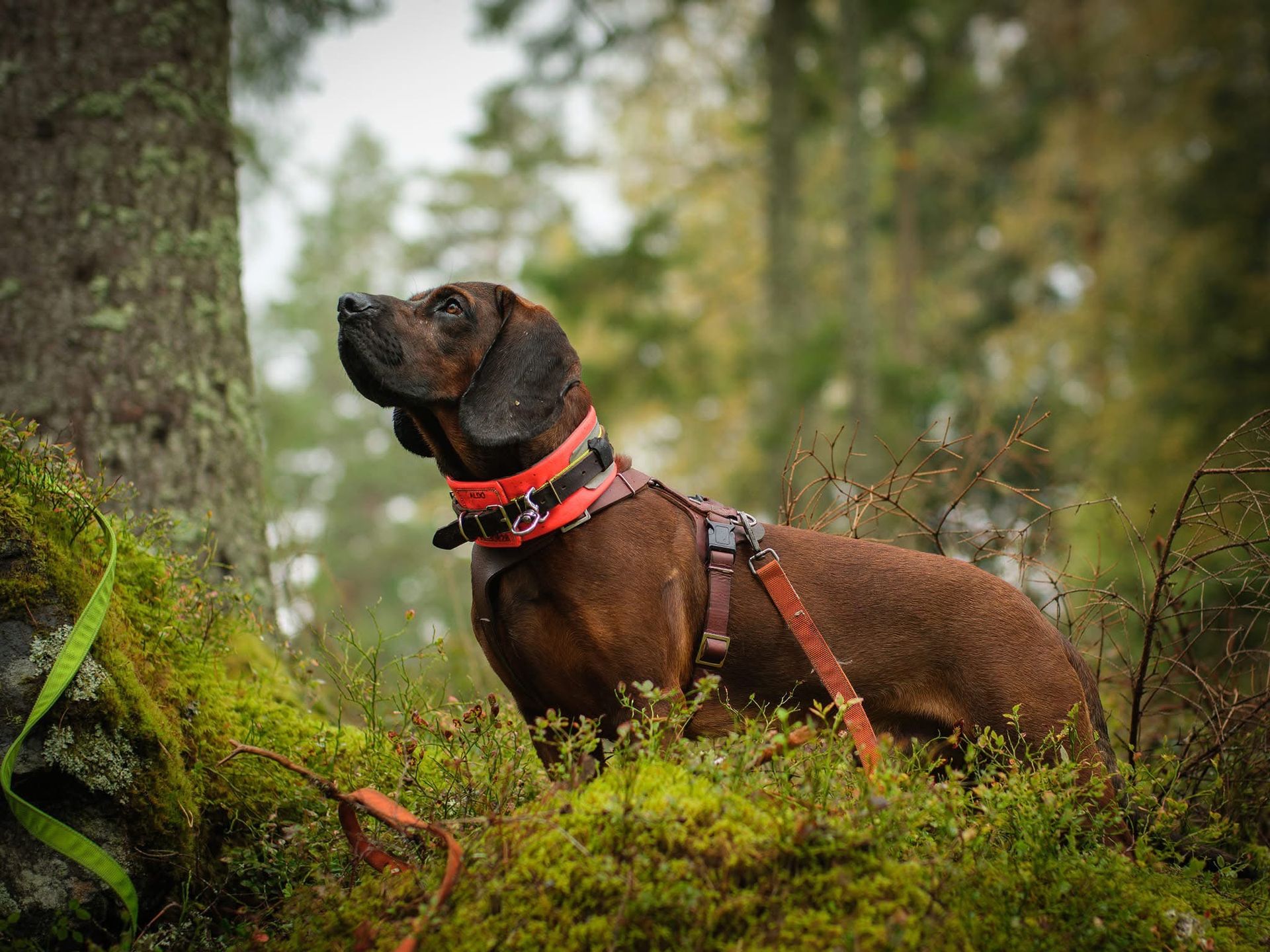 Der Schweißhund ist darauf trainiert, die Spuren eines verletzten Tieres zu verfolgen. Diese Spur kann sehr schwache Hinweise enthalten, wie zum Beispiel: